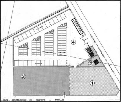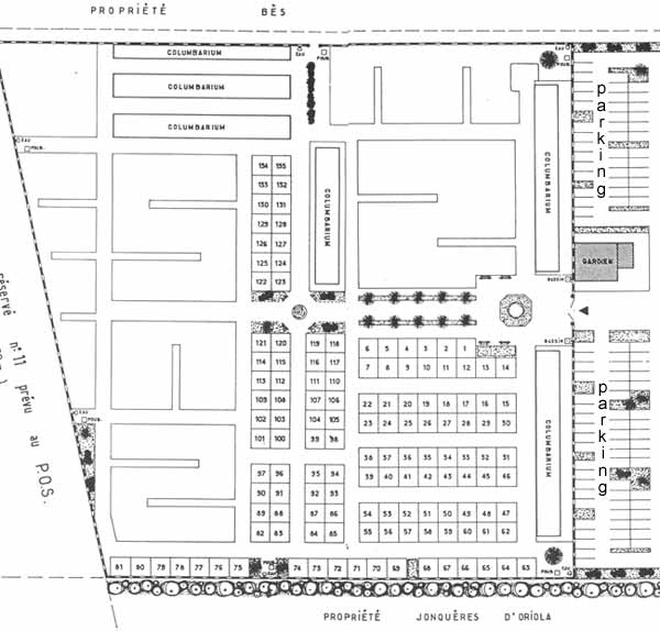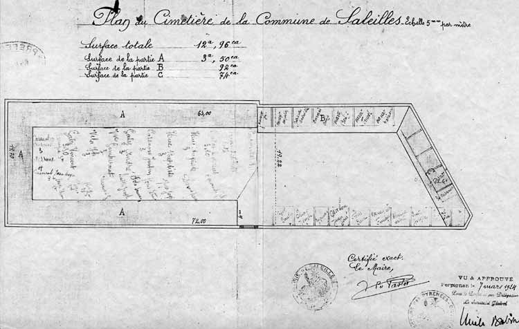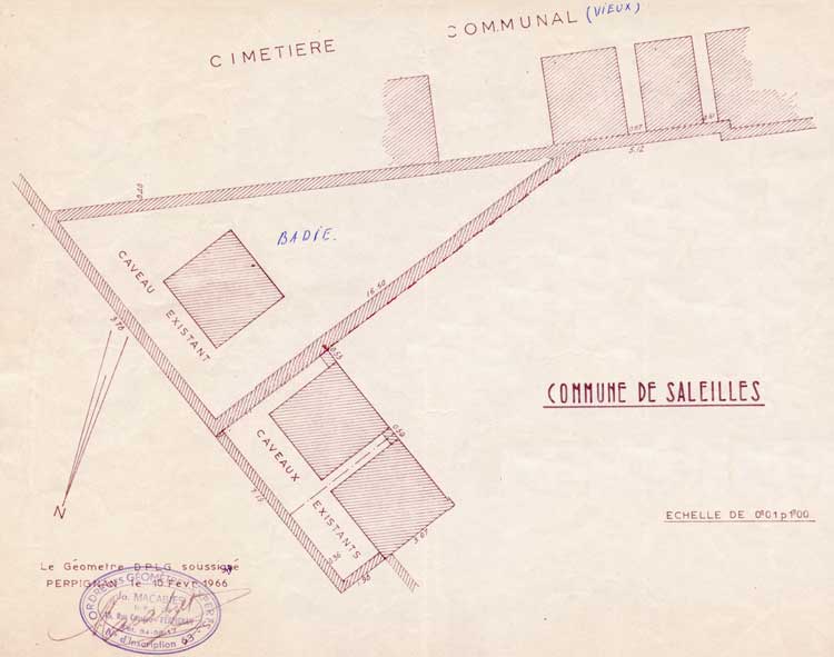 La loi du 24 août 1790 obligeait l'implantation des cimetières à 100 m de tout puits, sources et maisons d'habitation. L'emplacement du nouveau cimetière fut décidé à l'extérieur du village, sur la parcelle de Louis Batlle (plan de masse ) et construit à partir de 1885 (partie 1 du plan de masse) pour une somme de 1565,21 fr. Entre temps des trois caveaux privés furent montés contigus au cimetière (partie 2 ) avant que le déménagement ne soit entrepris à partir du 26 juillet 1893. Même la terre fut transportée : "c'est la terre des morts " nous diront les plus anciens ; c'est la raison pour laquelle la chapelle à ses fondations légèrement déterrées. Le cimetière sera agrandi par l'achat de deux terrains, 7 ares en 1922 et 12 ares supplémentaires en 1924 et imbriqué à la partie existante avec un mur qui ceinturera l'ensemble (partie 3 ). En 1964 les 31 ares 90 du terrain de M. Jonquères d'Oriola (partie 4) compléteront l'ensemble avec un nouveau mur de clôture, celui qui y est actuellement. Le vieux mur intérieur a été percé en deux endroits pour facilité le passage avec cette nouvelle zone. En 1988, un nouveau cimetière est construit sur une parcelle de 2 ha et 52 a, appartenant à Jonquères d'Oriola, au sud-ouest de la commune, près du Réart, le vieux cimetière est saturé.
