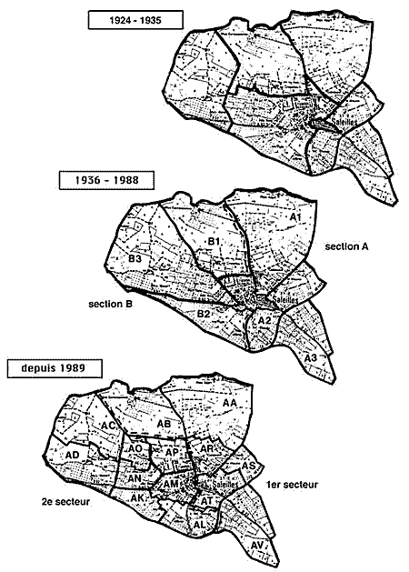 La France est divisée depuis la Révolution en petits secteurs ayant comme noyau les villages. La commune de Saleilles a eu ses limites actuelles fixées en 1924 lors de sa scission avec Cabestany (paragraphe sur la mairie ). Ayant comme frontière naturelle le Réart et la Fosseille, elle a comme voisin Perpignan, Cabestany, Alénya et Théza. Pour pouvoir être administré, l'état associe différentes communes pour former les cantons et les départements. Si ces derniers ont des limites fixes, les cantons varient au fil du temps. A partir de 1790 et encore en 1872 nous faisions parti du canton d'Elne. Nous passerons ensuite dans le canton de la côte Radieuse qui comprend Alénya, la Tour Bas Elne, Saint Cyprien, Saleilles, Cabestany, Saint Nazaire, et Canet. A partir de 1998, ces trois derniers villages ne font plus partie de notre canton qui a désormais les limites de notre communauté de commune "Sud Roussillon". Il est un autre découpage, c'est celui des communes, pour permettre d'en faire la cartographie et situer tous les terrains afin en connaître les limites exactes et leurs propriétaires. Depuis 1924 Saleilles a connu trois découpages (les trois cadastres ) dont le dernier, fait à partir de photos aériennes, est mis en service en 1989.