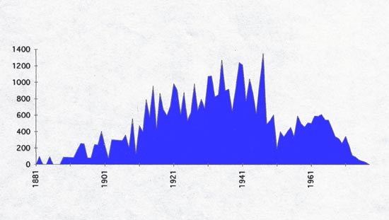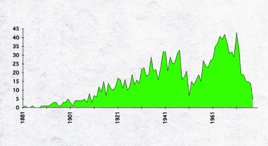 Je vous présente trois courbes réalisées daprès les relevés fait à létat civil de la mairie de Saleilles. La première courbe (les naissances ) montre le nombre de naissances par année dans le village de 1900 à 1978. nous constatons le manque d'enfant des années 1943 à 1945, séquelle de la guerre et qu'à partir de 1963 les naissances sont en diminution car les femmes vont accoucher dans les cliniques de Perpignan.