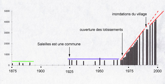 La seconde courbe est limage de la population habitant le village durant lannée 1978 (évolution de la population ). Cette dernière courbe bien arrondie démontre elle aussi la stabilité de la population, malgré le creux engendré par le manque denfants durant la guerre. La troisième courbe est lévolution de la population avec toutes les valeurs répertoriées (expansion démographique ). Nous constatons ici aussi la stabilité de la population pendant le premier siècle du graphique. Cest à partir de 1969 que la municipalité crée plusieurs lotissements , et, par conséquent, la démographie va démarrer avec l'arrivée dans la commune de nouveaux habitants et notamment des rapatriés d'Algérie, phénomène qui va s'accentuer au fil des années. Le profil professionnel des habitants de Saleilles s'est transformé. Alors qu'au XIXe siécle, la population était essentiellement composée d'agriculteurs, ils vont laisser la place aux nouvelles catégories sociaux professionnelles des cadres moyens, employés, professions sociales et même artistes (relevé de 1978). En 1992 linondation marque le ralentissement de lexpansion par le traumatisme de lévénement et ensuite par la mise en place du plan de zonage qui bloquera une grande partie des terrains constructibles jusqu'en 2003, à la mise en place du nouveau POS : plan d'occupation des sols.