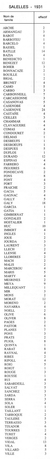 Lorsque l'on consulte les recensements de 1876, 1906 ou 1931, nous nous apercevons qu'il n'y a pas d'étrangers établis dans le village. En 1931 saleilles compte 457 habitants avec 111 noms de famille et 19 surnoms . Ceux ci servaient à différencier les personnes d'une même famille : mon grand père se nomme jean, mon père jeannot et mon frère petit jean. Le nom, dans la plupart des cas, n'est qu'un surnom officialisé. Ce n'est qu'à partir de 1936 que des espagnols fuyant leur pays passent la frontière. Quelques gardes-mobiles réquisitionnent la maison en haut de la place de la république (maison du kiné) et s'y installent pour surveiller le secteur et récupérer les espagnols errants. D'ailleurs, M. Triponey, un de ces gardes-mobiles restera définitivement au village. Quelques d'espagnols s'implanteront à Saleilles à cette époque et seront employés dans l'agriculture. Puis vint la guerre de 1940. Les allemands réquisitionent la maison Pouquet qui leur sert de quartier général. Ils vivront chez l'habitant et à l'école si nécessaire. Des hommes aussi sont quelques fois réquisitionnés pour des travaux. Les allemands mettront en place quelques batteries de canons à la sortie de Saleilles, en face de chez M. Roig, au pont de la fosseille et route de Saint Nazaire. Dans les maisons, les vitres des pièces utilisées le soir étaient peintes en bleu pour ne pas que les avions voient de la lumière. La seconde vague de déplacement de population se fera avec le retour de français d'Algérie en 1962. Mais ces trois arrivées de personnes qui représentent environ 50 habitants, ne correspondent pas vraiment à une augmentation significative de la population de Saleilles. Vers la fin du XXe siècle, avec la formation de l'Europe et l'ouverture des frontières, l'installation des étrangers dans le village ira en augmentant, attirés comme toujours par le climat et la douceur de vivre entre la mer et la montagne.