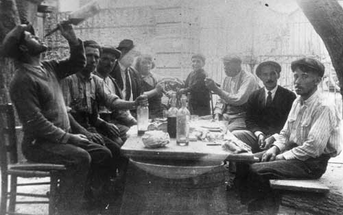 Repas avec le personnel dans la cour du mas. (-->) avant dernier, Baptiste Pastor Maire de Saleilles
